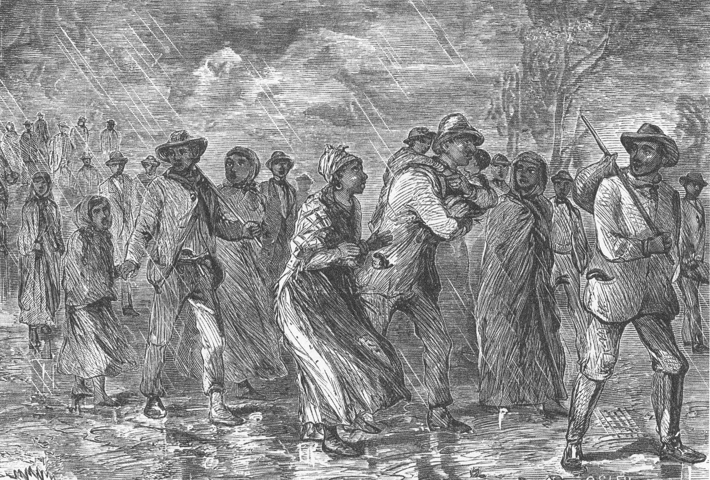Vintage illustration circa 1872-African American men women and children escaping from the confederate south